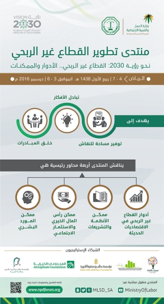 وتبرز أهمية المنتدى، الذي تنظمه وزارة العمل والتنمية الاجتماعية، وجامعة الملك فهد للبترول والمعادن ممثلة في مركز التميز لتطوير المؤسسات غير الربحية، خلال الفترة من 3-6 ديسمبر القادم في الرياض، بمشاركة 5 وزراء و14 متحدثا دوليا وبحضور أكثر من 400 مشارك، في ظل المستهدفات الإستراتيجية للوزارة التي وضعها برنامج التحول الوطني 2020، لتحقيق رؤية المملكة 2030، نحو تمكين القطاع غير الربحي، والتي تتمثل في بناء قدرات الجهات العاملة في القطاع غير الربحي، وتعزيز قدرتها على تبني ممارسات الشفافية.