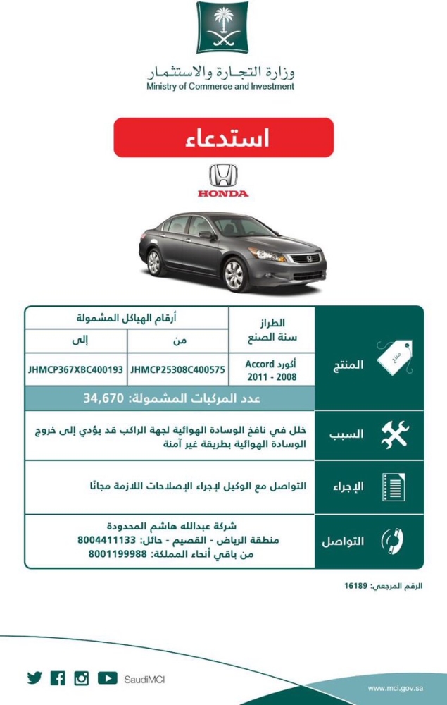 وأوضحت الوزارة عبر حسابها الرسمي على موقع “تويتر”، أن المركبات المستدعاة من طرازات “أكورد” موديلات من 2003 إلى 2011، و”أكورد كوبيه” من 2008 إلى 2011، و”بايلوت” من 2009 إلى 2011.