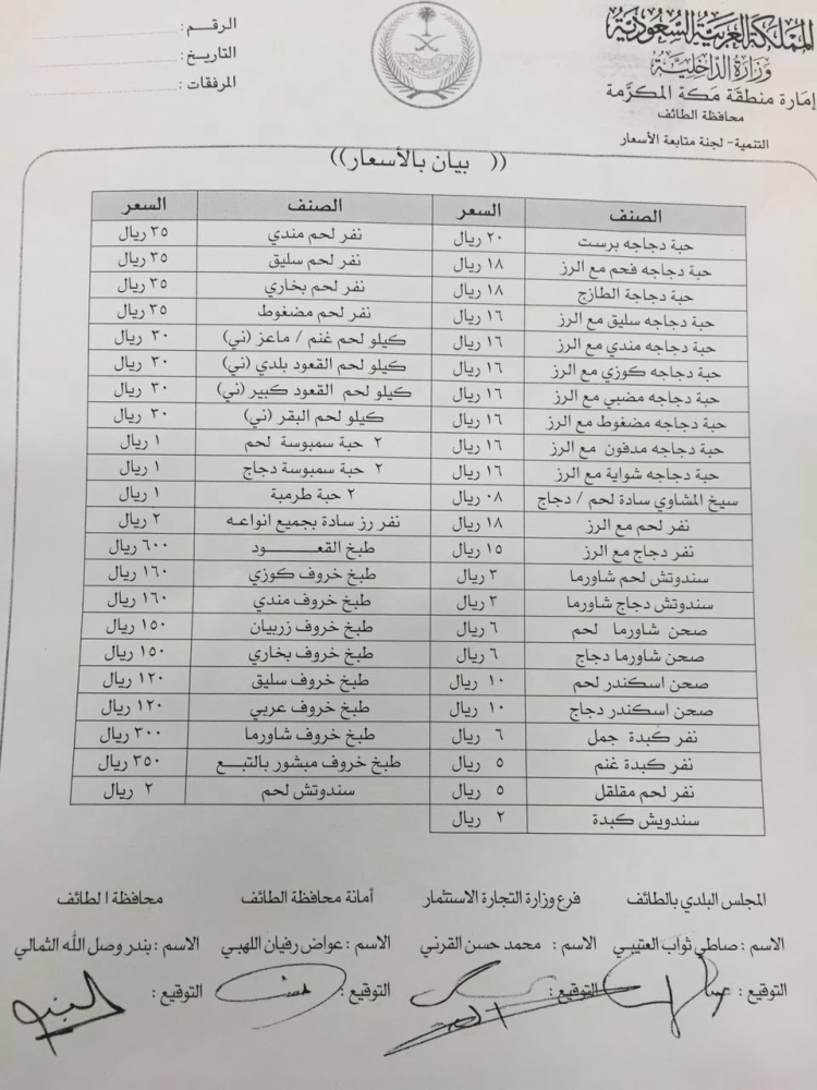 وكان رئيس مجلس بلدي الطائف ساطي العتيبي، ومندوب فرع التجارة محمد القرني، ومندوب الأمانة عواض اللهيبي، ومندوب محافظة الطائف بندر الثمالي، صادقوا على قائمة الأسعار الجديدة.