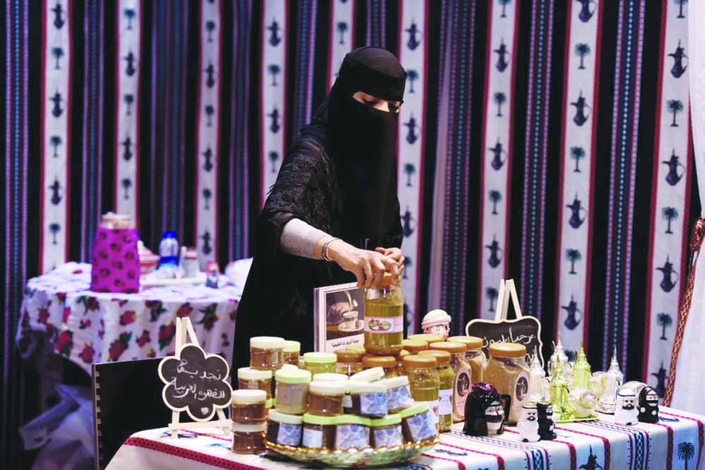 سيدة سعودية تعرض منتجاتها خلال معرض الأسر المنتجة. (عكاظ)