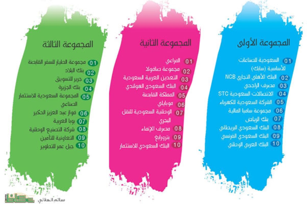 ثم جاء بنك الرياض بقيمة 8.8 مليار، وأصول 59.5 مليار، تلاه البنك السعودي البريطاني، بقيمة 8.4 مليار، وأصول 50.1 مليار، بأرباح 1.2 مليار، فالبنك السعودي الفرنسي بقيمة 8 مليارات، وأصول 49 مليارا، محققا صافي أرباح 1.1 مليار، ومن ثم البنك العربي الوطني بقيمة 5.1 مليار، وأصول 45.4 مليار، محققا صافي أرباح 788 مليونا. تلته شركة المراعي بقيمة 11.5 مليار، وأصول 7.3 مليار، محققة صافي أرباح 511 مليونا، ثم مجموعة صافولا، بقيمة 7 مليارات، وأصول 34.9 مليار، محققة صافي أرباح 558 مليونا، أعقبتها التعدين العربية السعودية، معادن بقيمة 2.9 مليار، بأرباح 216 مليونا، ثم البنك السعودى الهولندي، بقيمة 3.8 مليار، بأصول 28.8 مليار، وأرباح 539 مليونا.