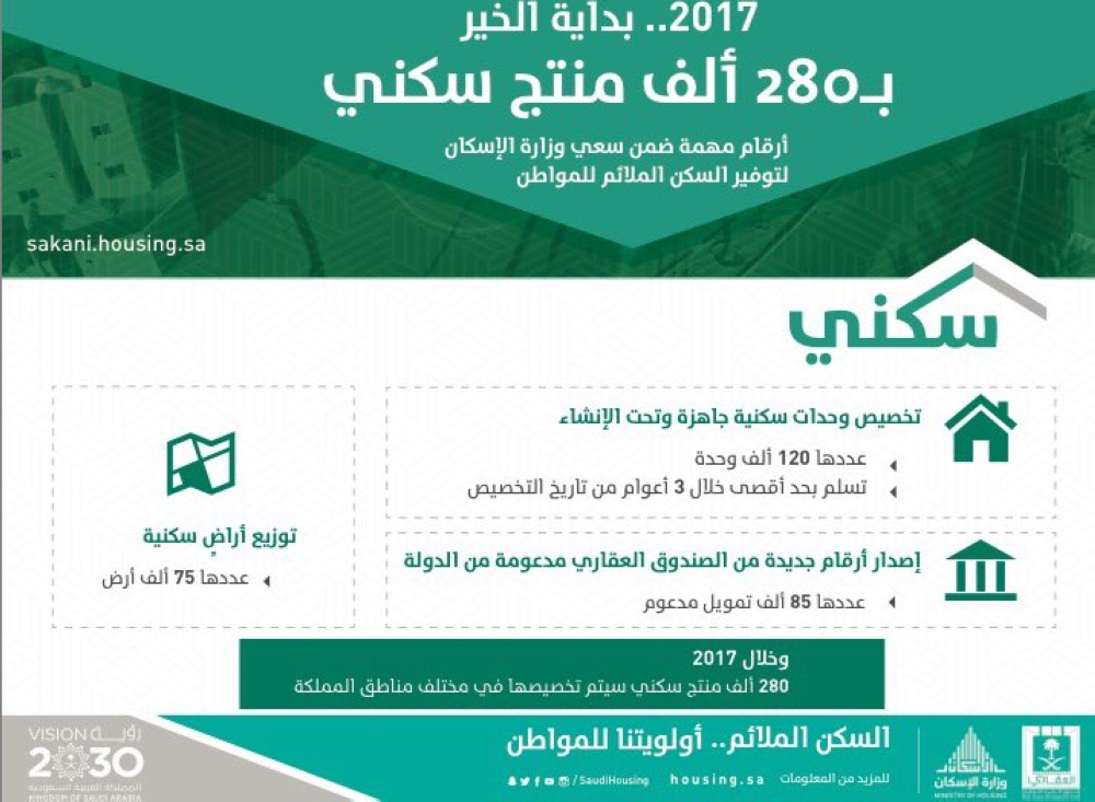 أعلنت وزارة الإسكان عن إطلاق أولى دفعات برنامج "سكني" الذي يتضمّن 280 ألف منتج سكني وتمويلي للتخصيص والتسليم في جميع مناطق المملكة، موضحة أن المنتجات تشمل 120 ألف وحدة سكنية بالشراكة مع القطاع الخاص متنوعة المساحات بحسب معايير الدخل وعدد أفراد الأسرة، على أن يتم تخصيصها خلال العام الجاري ابتداء من الشهر المقبل، وتسليمها خلال مدة أقصاها 3 أعوام، وكذلك 75 ألف أرض سكنية جاهزة للبناء، إضافة إلى 85 ألف دعم تمويلي مدعوم التكاليف من الدولة، وذلك بالشراكة بين صندوق التنمية العقارية والبنوك والمؤسسات التمويلية.