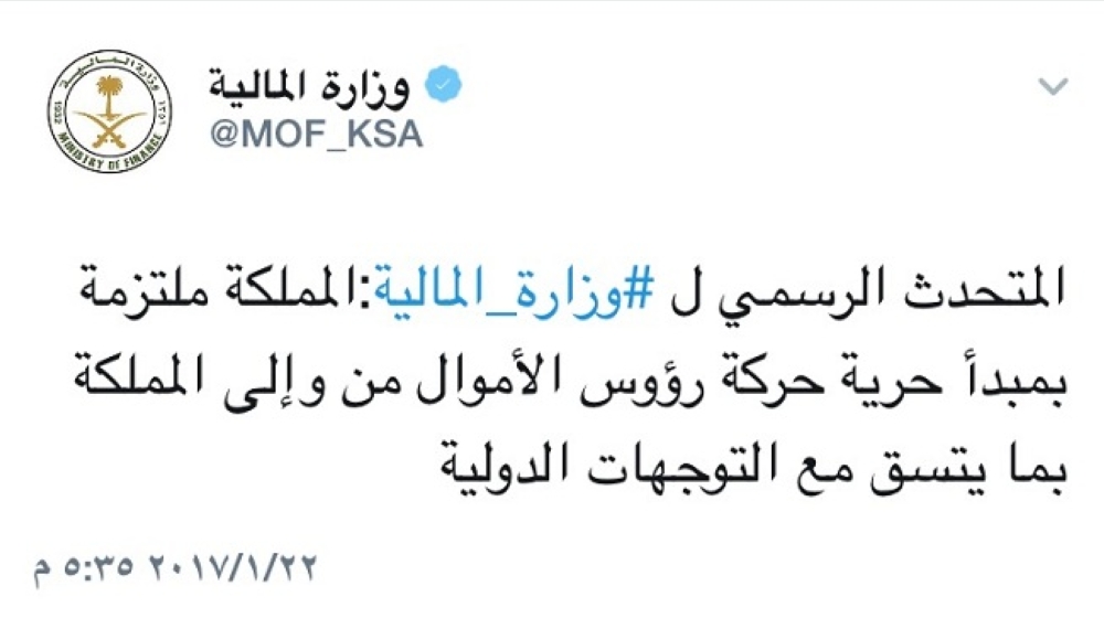 وقال في رده على سؤال حول ما يتم تداوله مؤخراً في عدد من وسائل الإعلام حول مقترح فرض رسوم على التحويلات المالية للخارج :" إن المملكة ملتزمة في هذا الشأن بمبدأ حرية حركة رؤوس الأموال بما في ذلك التحويلات من وإلى المملكة بما يتسق مع التوجهات الدولية في هذا الخصوص"