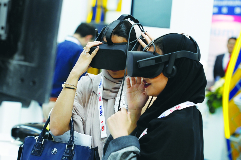 امرأتان سعوديتان تشاهدان بعض التقنيات التي تستخدمها شركة «أرامكو السعودية» في التعامل مع الزيت والغاز من خلال نظارتين للواقع الافتراضي. (رويترز)