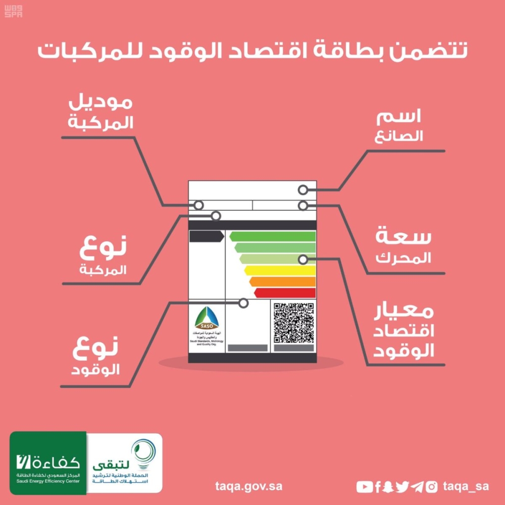 تُظهر بطاقة " اقتصاد الوقود في المركبات " مدى استهلاك الطاقة لكل طراز من المركبات، حيث صُنفت قيم اقتصاد الوقود إلى ستة مستويات (ممتاز، جيد جدًا، جيد، متوسط، سيئ، سيئ جدًا).