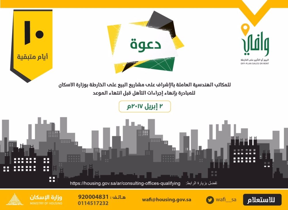 دعا برنامج البيع والتأجير على الخارطة (وافي) التابع لوزارة الإسكان، المكاتب الاستشارية الهندسية العاملة في مشاريع البيع والتأجير على الخارطة إلى سرعة إنهاء الإجراءات اللازمة لتأهيلهم للعمل في تلك المشاريع، قبل انتهاء الموعد المحدد لفترة التأهيل في الثاني من أبريل القادم.