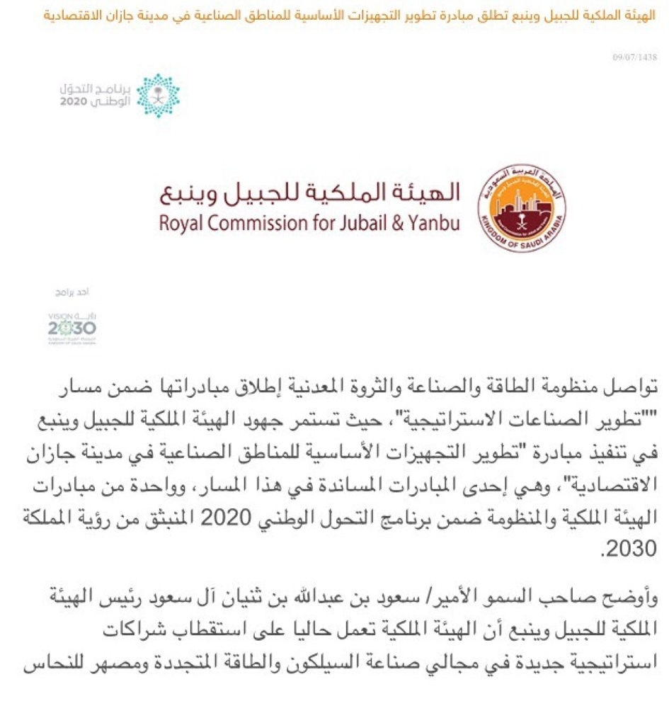 وأوضح الأميرسعود بن عبدالله بن ثنيان آل سعود رئيس الهيئة الملكية للجبيل وينبع أن الهيئة الملكية تعمل حاليا على استقطاب شراكات استراتيجية جديدة في مجالي صناعة السيلكون والطاقة المتجددة ومصهر للنحاس بالتعاون مع البرنامج الوطني لتطوير التجمعات الصناعية.