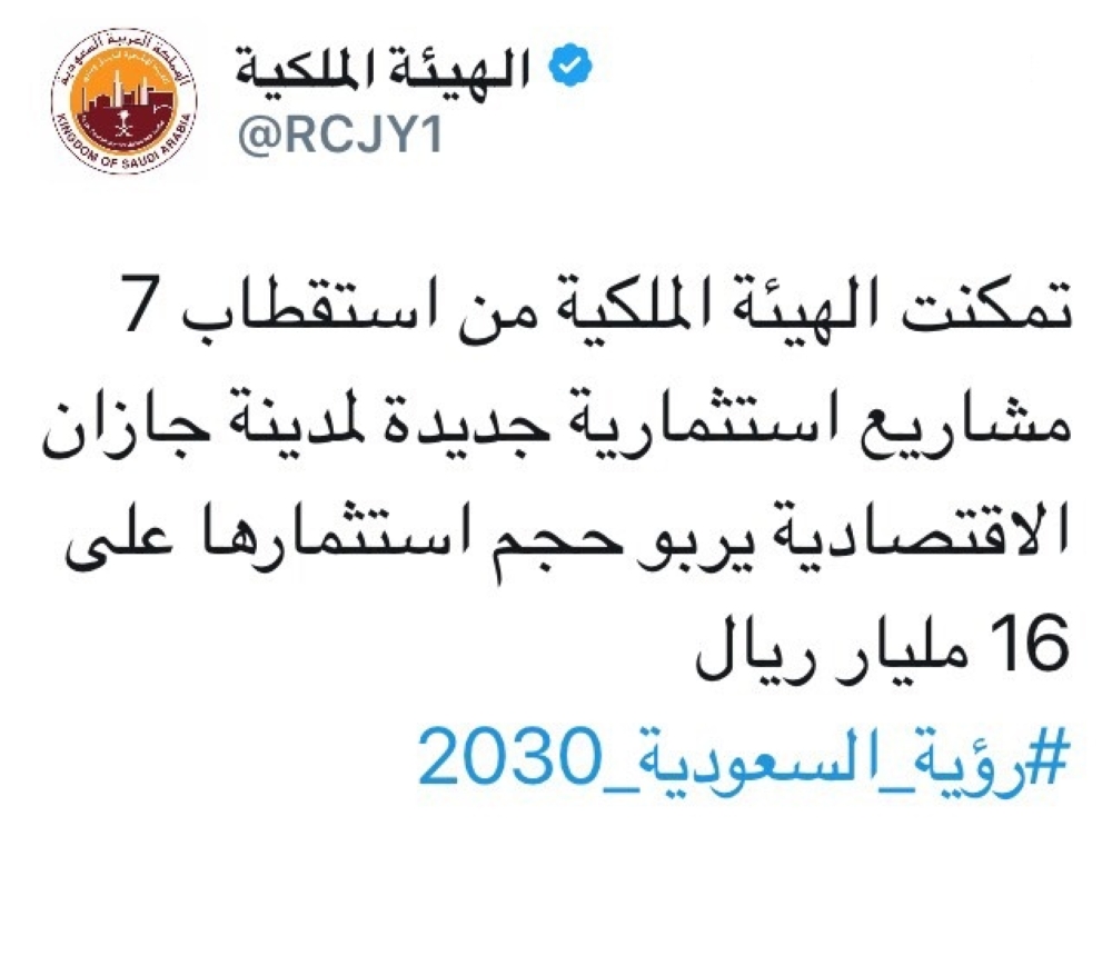 أعلنت الهيئة الملكية بالجبيل وينبع أنها تمكنت من استقطاب 7 مشاريع استثمارية جديدة لمدينة جازان الاقتصادية يربو حجم استثمارها على 16 مليار ريال.