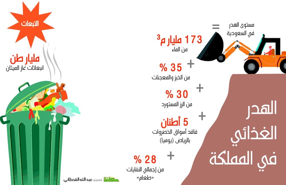 في المقابل، ذكر مدير عام إدارة الإرشاد الزراعي الدكتور سعود الحقيل أن المملكة تنتج تسعة آلاف طن من الأطعمة بينما تستورد 20 ألف طن، وقدرت وزارة الشؤون البلدية والقروية مقدار النفايات في المملكة لعام 2015 بما يقارب 14 مليون طن بلغت نسبة مخلفات الطعام منها 28%.