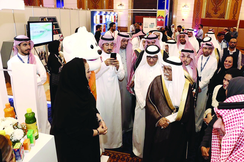 جمال وعلوي يطلعان على الفرص الوظيفية بمعرض المهنة. (عكاظ)