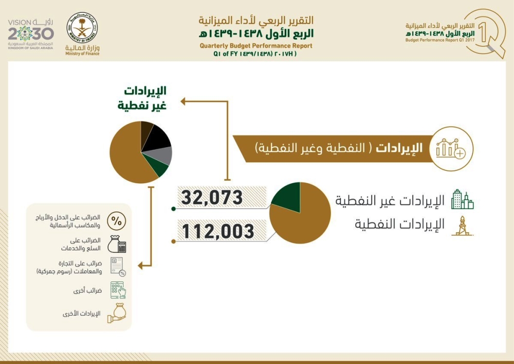 وأوضح أن التقرير الربعي أبرز المؤشرات المالية لأداء الميزانية العامة للدولة للربع الأول من السنة المالية 1438/ 1439هـ (2017م)، مبيناً أن إجمالي الإيرادات للربع الأول بلغت 144,076 مليار ريال سعودي، مسجلةً ارتفاعاً بنسبة 72 في المئة عن الربع المماثل من العام الماضي، وبلغت الإيرادات غير النفطية للربع الأول 32 مليار ريال سعودي، مسجلة بذلك ارتفاعاً بنسبة 1 في المئة مقارنة بالربع المماثل من العام الماضي.