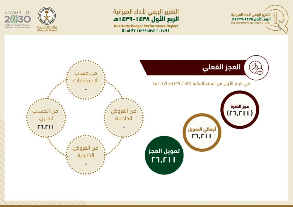 وكشف أن العجز في الربع الأول بلغ 26,211 مليار ريال سعودي، مسجلاً انخفاضاً بواقع 71 في المئة مقارنةً بعجز الفترة المماثلة من العام الماضي.