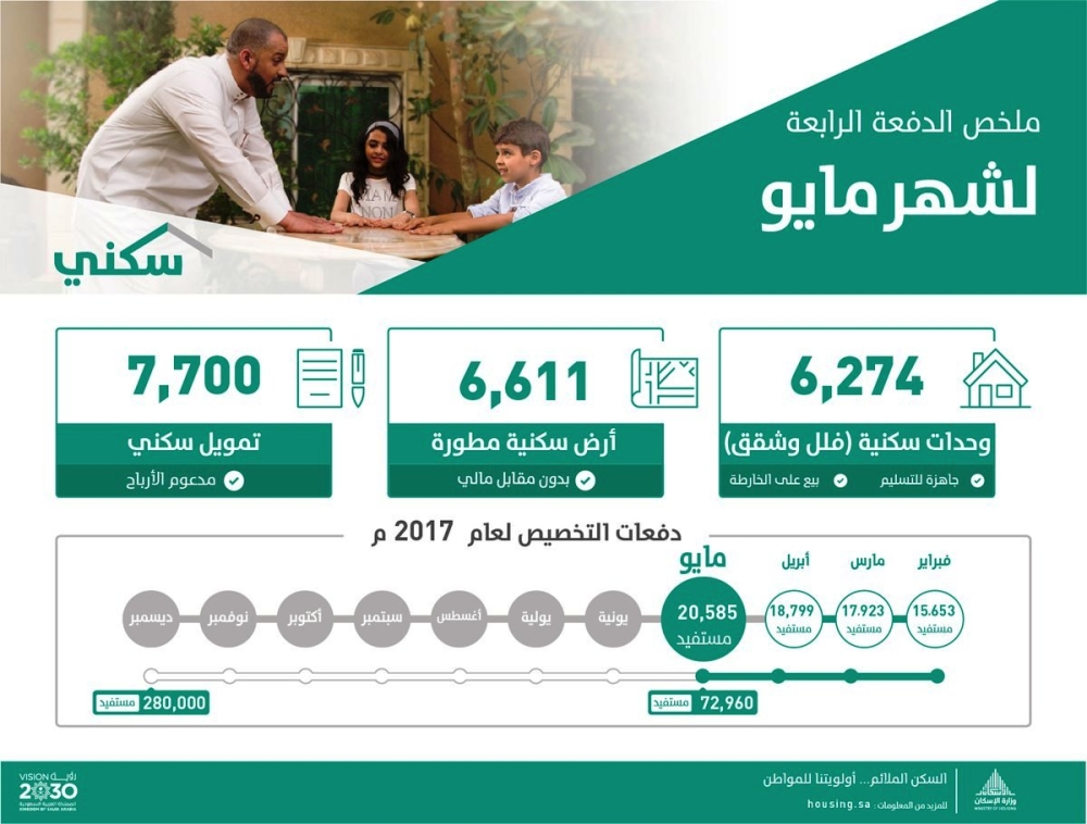 يذكر أن وزارة الإسكان أعلنت في 15 يناير الماضي عن إطلاق برنامج "سكني" الذي يتضمن 280 ألف منتج سكني وتمويلي كمستهدف لعام 2017، وأطلقت الدفعة الأولى في 15 فبراير الماضي بعدد منتجات بلغ 15653 منتجاً، فيما جاءت الدفعة الثانية بعدد 17923 منتجاً، أما الدفعة الثالثة فبلغت 18.799 منتجاً.