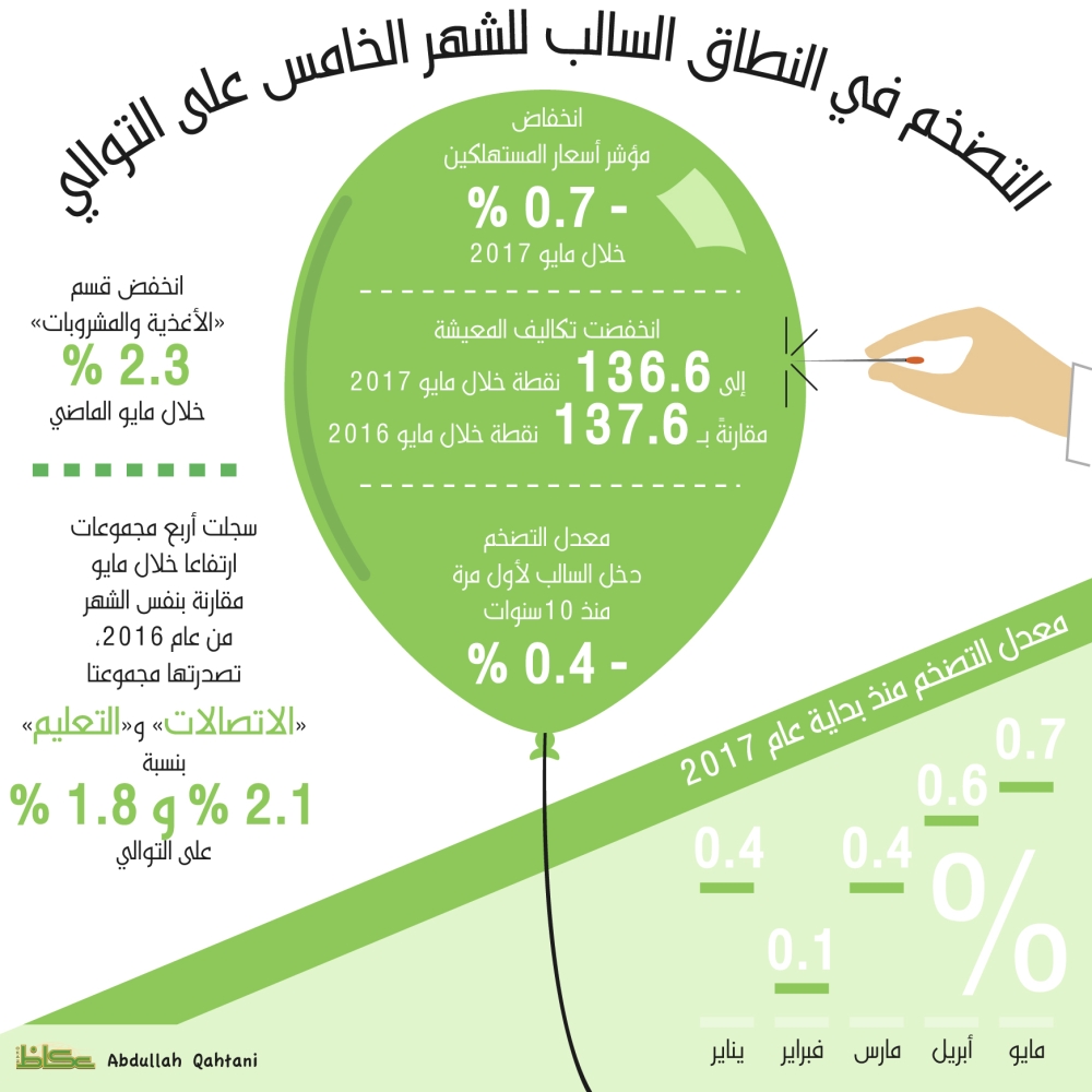 واصل معدل التضخم في السعودية البقاء في منطقة السالب للشهر الخامس على التوالي، بعد أن وصل التضخم إلى السالب في يناير الماضي، وذلك بحسب بيانات الهيئة العامة للإحصاء من خلال تقريرها لأسعار تكلفة المعيشة لشهر مايو.
