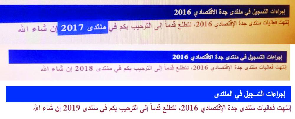 3 لافتات تظهر تأجيل منتدى جدة من 2017 إلى 2019. (عكاظ)