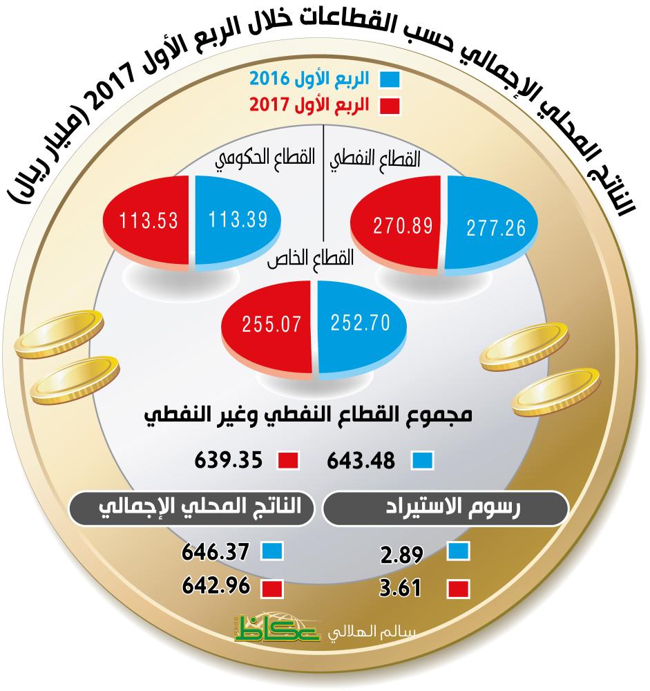 فيما سجل الناتج المحلي للقطاع النفطي تراجعا بـ 2.3% لتصل قيمته إلى 270.89 مليار ريال خلال الربع الأول لـ 2017، مقارنة بنحو 277.26 مليار في الربع الأول من العام الماضي 2016، لتبلغ نسبة مساهمته في الناتج المحلي الإجمالي 42.13% مقارنة بنحو 42.89% في نفس الفترة العام الماضي.