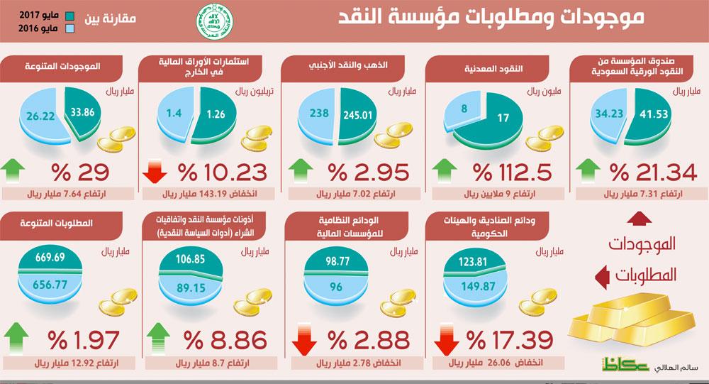 وارتفعت الموجودات المتنوعة لمؤسسة النقد بأكثر من 29% بزيادة 7.64 مليار ريال، لتسجل الموجودات المتنوعة في مايو الماضي 33.86 مليار ريال، مقارنة بـ26.22 لشهر مايو لعام 2016.