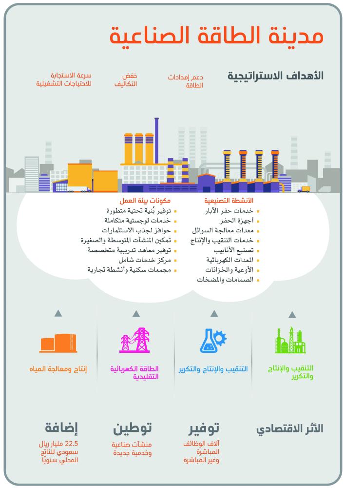 وكان مجلس الوزراء قد وافق على إنشاء مدينة صناعية في المنطقة الشرقية باسم «مدينة الطاقة الصناعية»، وتخصيص أرض مساحتها 50 كيلو مترا مربعا لإقامة المدينة المشار إليها، كما وافق المجلس على العرض المقدم من أرامكو السعودية المتضمن تأسيس شركة تتولى تطوير البنية التحتية لمدينة الطاقة الصناعية وإدارة أصولها الثابتة.
