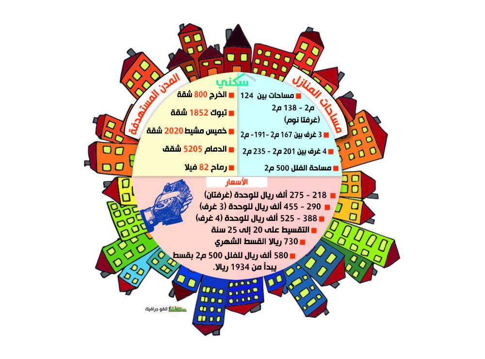 طرح برنامج «سكني» التابع لوزارة الإسكان 9959 وحدة سكنية أمام المستفيدين في 5 مدن، هي (الخرج، وتبوك، وخميس مشيط، والدمام، ورماح»، ضمن برنامج الشراكة مع القطاع الخاص، بإشراف 10 شركات تطوير عقارية، تقدم بنظام «البيع على الخارطة» وتسلم للمستفيدين في غضون 3 سنوات، بأسعار تراوح ما بين 218-275 ألف ريال للوحدة ذات الغرفتي نوم، و290-455 ألف ريال لثلاث غرف، و388-525 ألف ريال لأربع غرف، بأقساط تبدأ من 20 إلى 25 عاما، بقسط شهري يبدأ بـ730 ريالا.