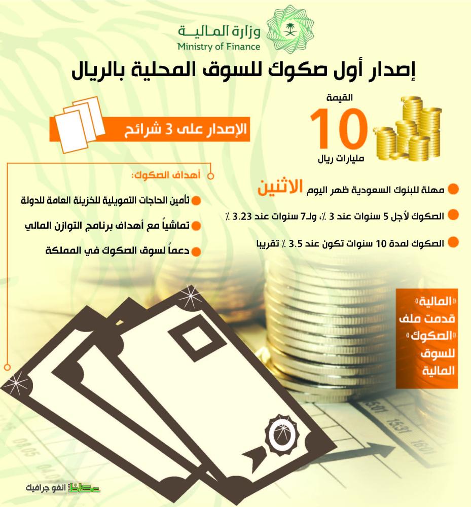 أعلنت وزارة المالية إصدار أول صكوك للسوق المحلية بالريال على ثلاث شرائح، وسط توقعات بأن تكون قيمة الإصدار 10 مليارات ريال.