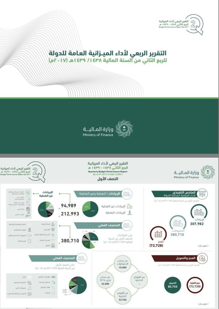 أعلنت وزارة المالية، اليوم (الأحد)، بلوغ إجمالي الإيرادات للربع الثاني من السنة المالية 1438/ 1439هـ (2017م)، 163.906 مليارات ريال، مسجلةً ارتفاعاً بنسبة 6 في المئة عن الربع المماثل من العام الماضي، فيما بلغت الإيرادات غير النفطية 62,916 مليار ريال، وبلغت الإيرادات النفطية خلال الربع الثاني 100،99 مليار ريال، بنسبة نمو بلغت 28 في المئة مقارنةً بالربع المماثل من العام الماضي، مدفوعاً بتحسن أسعار النفط في الأسواق العالمية، فيما بلغت المصروفات 210.4 مليار ريال، ليبلغ العجز 46.5 مليار ريال.