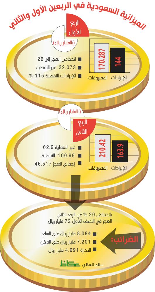 وبلغت نسبة المنصرف الفعلي خلال الربع الثاني نحو 23% من إجمالي الميزانية المقدرة خلال العام، في حين بلغ العجز في الربع الثاني 46.517 مليار ريال، مسجلا انخفاضاً بنسبة 20% مقارنة بالعجز المسجل بالربع المماثل من العام الماضي.