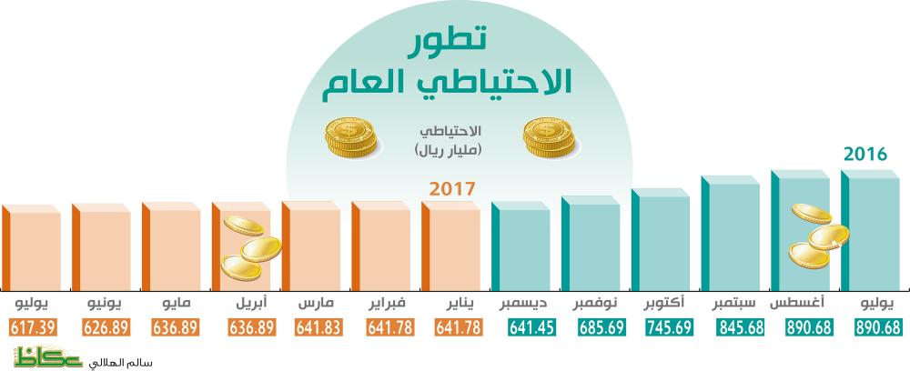 في إصرارها على المضي قدما في سياسة الإصلاح، ومواجهة المتغيرات الحادة في سوق النفط، وتحقيق الاستقرار المالي، وإعادة هيكلة الاقتصاد واستدامة الإنفاق، والوصول لمرحلة التوازن المالي 2020، انخفض الاحتياطي العام للسعودية خلال شهر يوليو الماضي بمقدار 9.5 مليار ريال ليصل الى 617.4 مليار ريال مقارنة بشهر يونيو 2017، وذلك بحسب ما أظهرت البيانات الشهرية لمؤسسة النقد العربي السعودي «ساما».