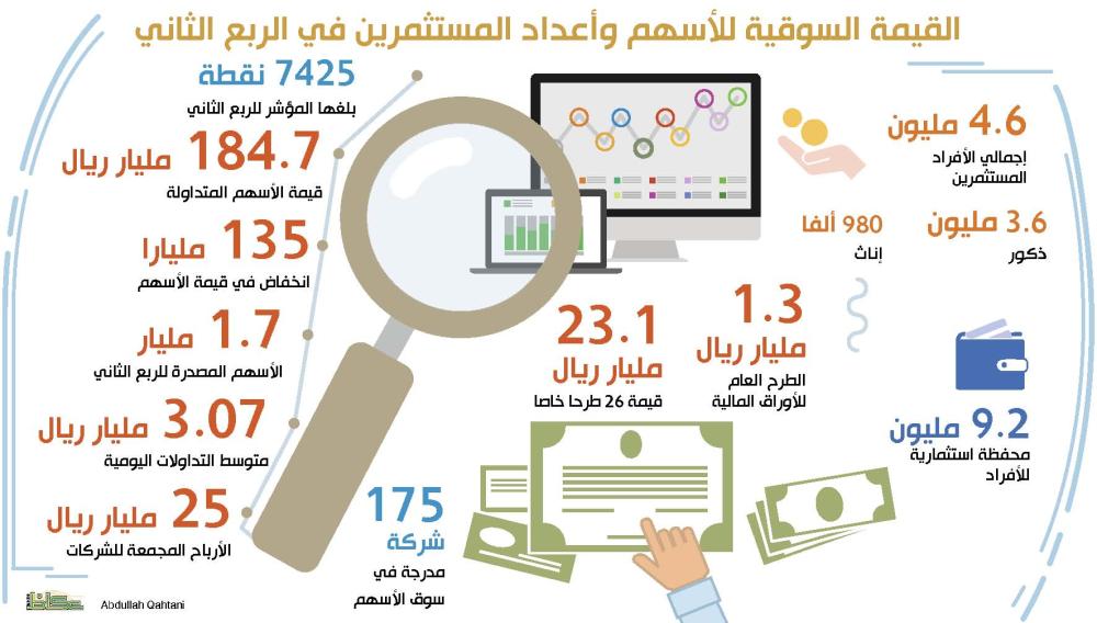 وأوضح أن مؤشر سوق الأسهم السعودية للربع الثاني بلغ 7425 نقطة، بارتفاع 425 نقطة عن الربع الأول من العام الحالي، وزيادة بنحو ألف نقطة عن الربع المماثل من العام الماضي.
