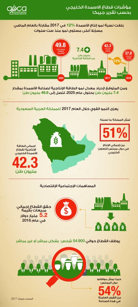 ولفت التقرير إلى أن قطاع الأسمدة الخليجي بلغت طاقته الإنتاجية 42.3 مليون طن في 2017؛ ما يمثل نموا بنسبة 12% عن السنة التي سبقتها.