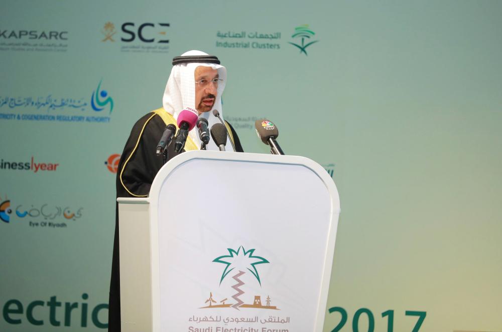 الفالح متحدثاً في الملتقى السعودي للكهرباء. (واس)
