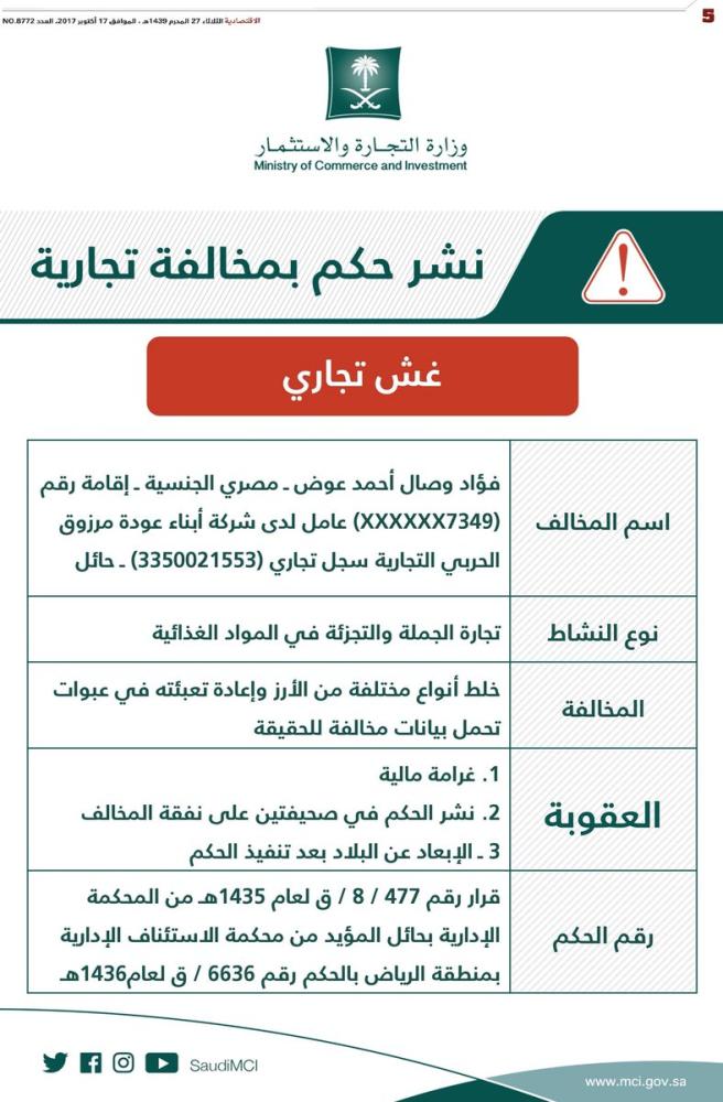 أعلنت وزارة التجارة والاستثمار صدور حكم قضائي يقضي بفرض غرامة مالية والتشهير والإبعاد ضد مقيم من جنسية عربية يعمل لدى مصنع لشركة تزاول أنشطة تجارة الجملة والتجزئة في حائل، وذلك إثر مخالفته لنظام مكافحة الغش التجاري ونظام العلامات التجارية وضلوعه في خلط أنواع مختلفة من الأرز وإعادة تعبئته في عبوات تحمل بيانات تجارية مخالفة للحقيقة، ويتم ذلك بطريقة بدائية، وغير صحية تهدد سلامة المستهلكين، فيما أوقفت الوزارة نشاط المصنع المتورط في حينها وأغلقته، واستدعت المسئولين للتحقيق وتطبيق الإجراءات النظامية بحقهم.