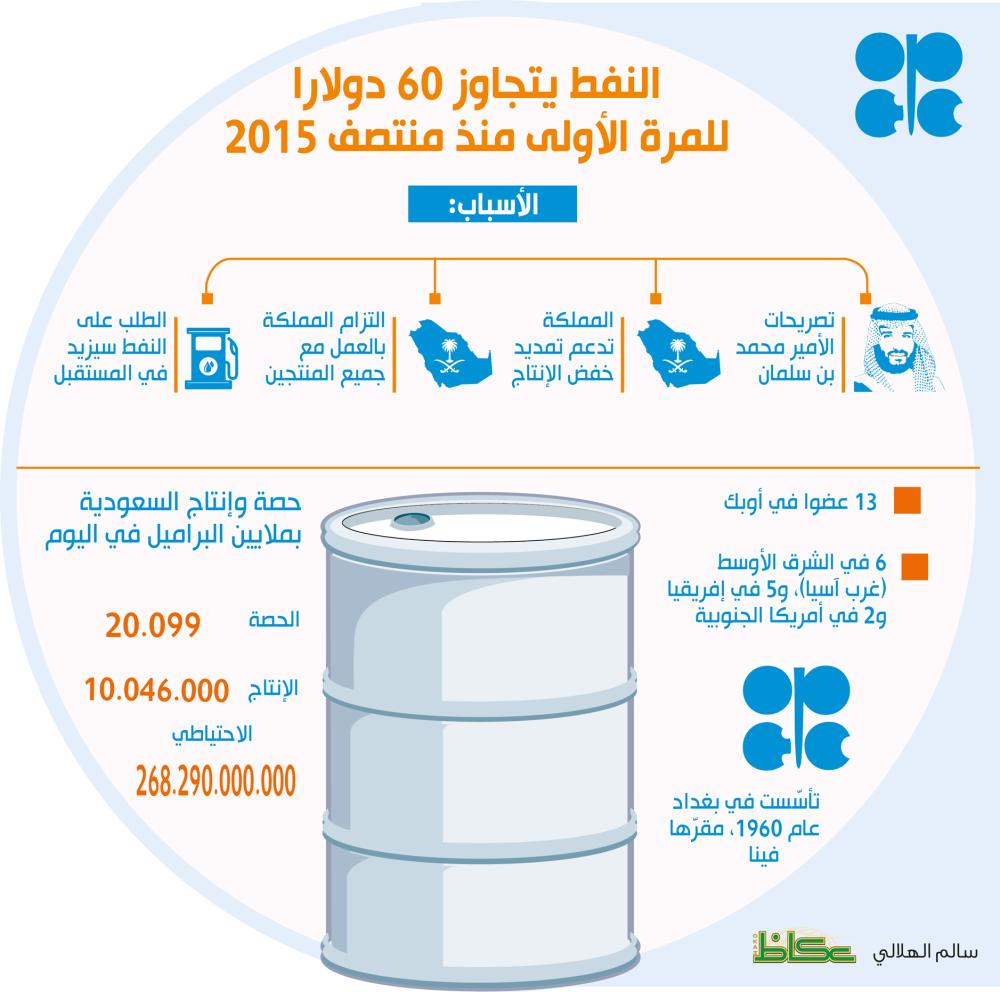 من ناحيته، ذكر الخبير الاقتصادي الدكتور تيسير الخنيزي لـ«عكاظ» أن ارتفاع أسعار النفط لمستوى 60 دولارا للمرة الأولى منذ يوليو 2015 مرتبط بعدة عوامل رئيسية، منها تراجع حجم المخزون الإستراتيجي في الولايات المتحدة والدول الغربية، إضافة إلى اقتراب موسم الشتاء؛ ما يرفع مستوى استهلاك الوقود في الدول الغربية لاستخدامات التدفئة.