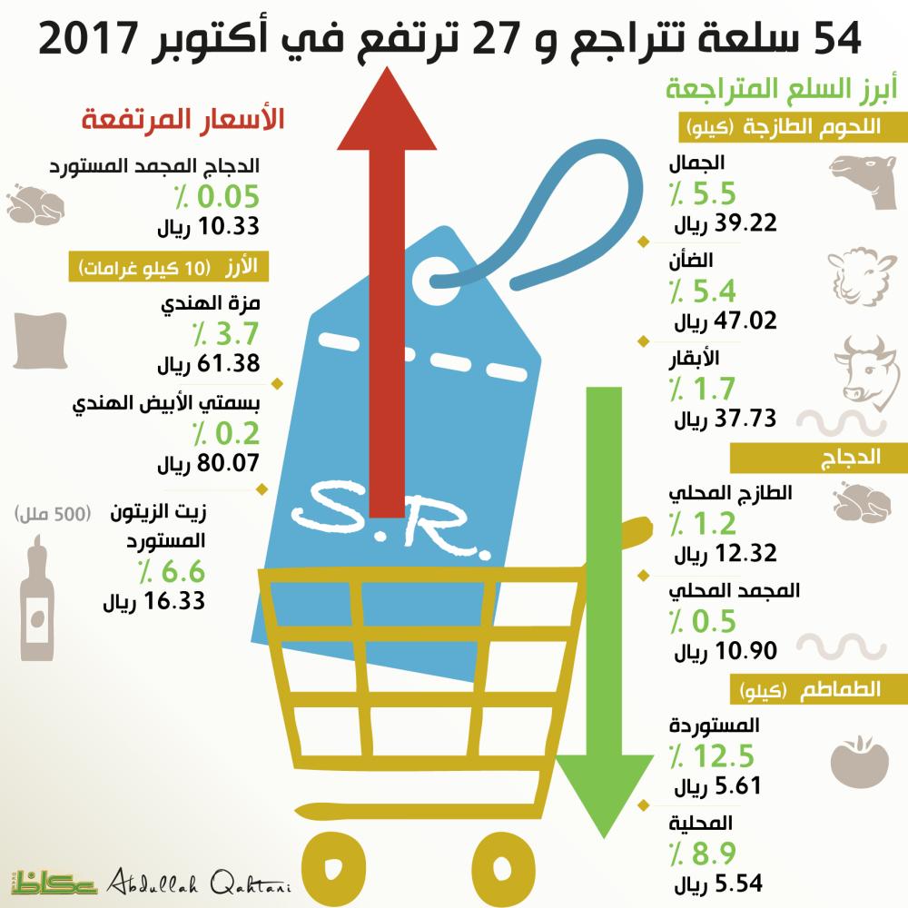 تراجعت أسعار 54 سلعة غذائية، مقابل ارتفاع أسعار 27 سلعة، على أساس سنوي بنهاية شهر أكتوبر الماضي، وذلك بحسب بيانات الهيئة العامة للإحصاء أمس (الأحد).