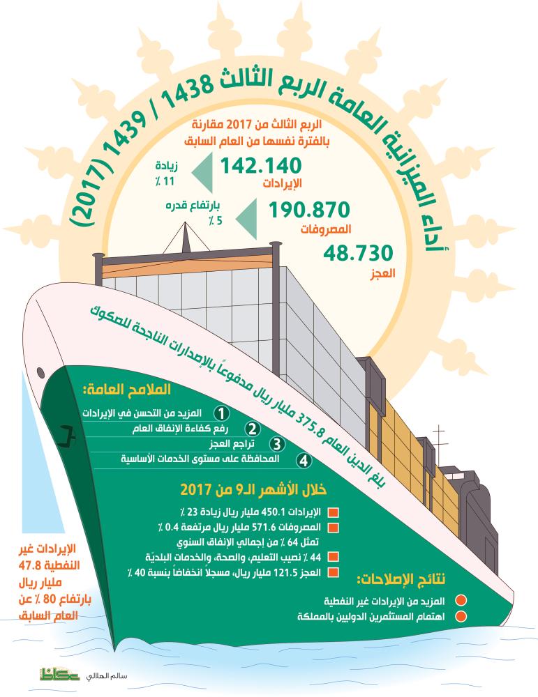 وقد جاءت المؤشرات المالية لأداء الميزانية العامة للدولة للربع الثالث من السنة المالية 1438 / 1439هـ (2017)، على النحو التالي: بلغ إجمالي الإيرادات في الربع الثالث 142.1 مليار ريال، محققة زيادة قدرها 11% عن نفس الفترة من العام السابق، فيما بلغت الإيرادات غير النفطية 47.8 مليار ريال، مسجلة ارتفاعا بنسبة 80% عن العام السابق، ما يؤكد جدوى الإصلاحات الاقتصادية.
