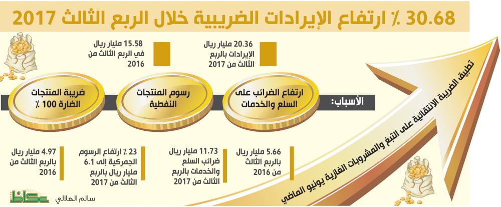 وكشف التقرير أن زيادة الإيرادات الضريبية بالربع الثالث من 2017، جاءت بسبب ارتفاع الضرائب على السلع والخدمات، منها رسوم المنتجات النفطية، وضريبة المنتجات الضارة بنسبة 100%، علما أن السعودية طبقت الضريبة الانتقائية على منتجات التبغ، والمشروبات الغازية مطلع شهر يونيو الماضي.