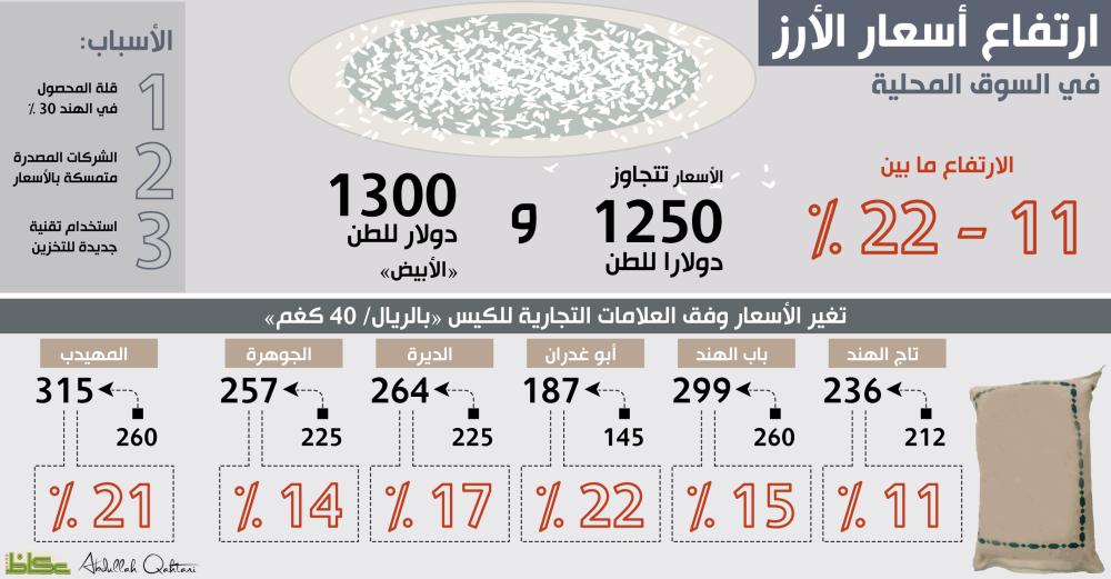 وأوضح فتحي السيهاتي «مستثمر» لـ«عكاظ» أن أسباب الزيادة عوامل خارجية وأخرى داخلية، فالشركات الهندية المصدرة للأرز متمسكة بالمستويات السعرية، إذ تلقت شركته عروضاً (الخميس) الماضي بسعر 1300 ريال للطن «السيلة» و1350 ريالاً للطن «الأبيض».