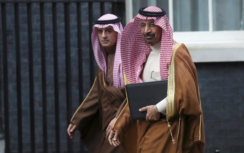 الفالح أمس الأول (الأربعاء) خارج مبنى الرئاسة البريطانية في 10 "داوننغ ستريت" قبل اجتماع موسع مع الحكومة البريطانية .