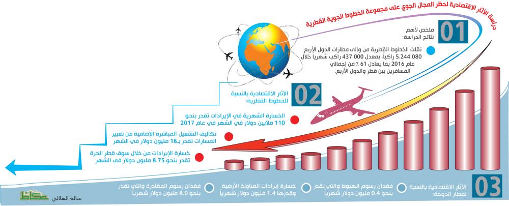 وتشير دراسة حديثة (حصلت «عكاظ» على نسخة منها) إلى أن عدد الركاب الذين نقلتهم الخطوط القطرية من وإلى مطارات الدول الأربع بلغ 5244080 راكباً بمعدل 437000 راكب شهرياً خلال عام 2016، وبما يعادل 61% من إجمالي المسافرين بين قطر والدول الأربع.