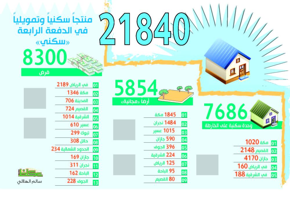 وأشارت إلى أن هذه الدفعة تشمل تخصيص 7686 وحدة سكنية تحت الإنشاء (البيع على الخارطة)، بالشراكة مع المطورين العقاريين، موزعة على منطقة مكة المكرمة 1020، ومنطقة القصيم 2148 وجازان 4170، و160 وحدة في الرياض، و188 في المنطقة الشرقية، فيما تتوزع الأراضي المجانية والبالغة 5854 أرضاً على 9 مناطق تشمل 1845 أرض في مكة المكرمة، و1484 في منطقة نجران، و1015 في عسير، 590 في جازان، 396 في الجوف، 224 في المنطقة الشرقية، 125 في الرياض، 95 في الباحة، و80 أرضاً في منطقة القصيم.
