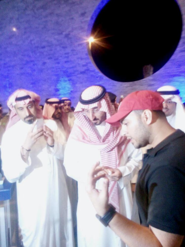 الأمير عبدالله بن بندر يستمع لشرح عن مشروع أحد الشباب.