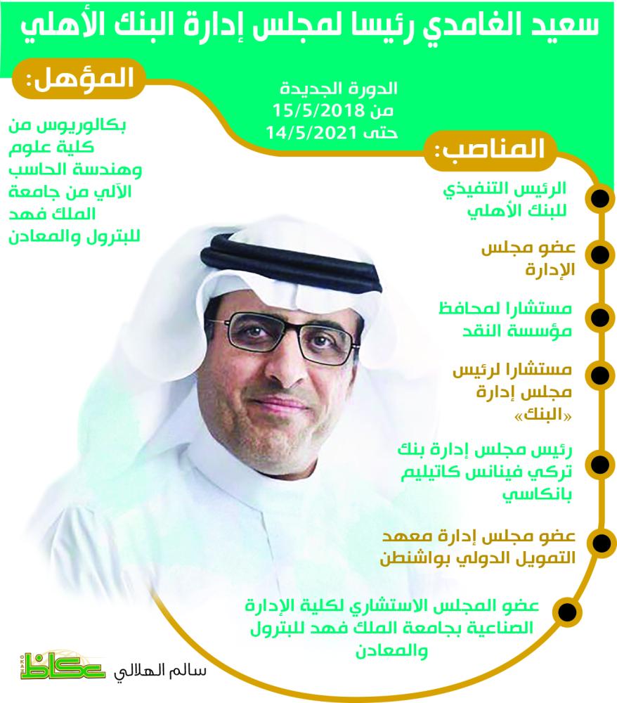 سعيد الغامدي الحاصل على درجة البكالوريوس في كلية علوم وهندسة الحاسب الآلي من جامعة الملك فهد للبترول والمعادن، الذي تقلد العديد من المناصب القيادية في القطاع المصرفي، بعد تفرغه للأعمال الاستشارية البنكية في مارس 2012، وعمله مستشارا لمحافظ مؤسسة النقد العربي السعودي (ساما)، ومستشارا لرئيس مجلس إدارة «البنك الأهلي التجاري»، صدر قرار مجلس إدارة البنك الأهلي بتوليه رئاسة المجلس في دورته الجديدة التي بدأت في 15/‏5/‏2018، حتى 14/‏5/‏2021، إضافة إلى تعيين راشد شريف نائبا له.