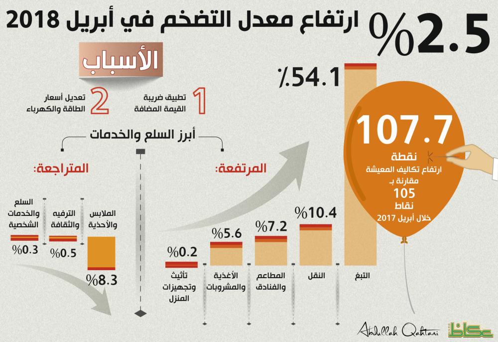 ارتفع الرقم القياسي لأسعار المستهلك «التضخم» بالسعودية خلال شهر أبريل الماضي من العام الحالي 2018 بنسبة 2.5% على أساس سنوي، مقارنة بالشهر نفسه من العام الماضي 2017؛ نظرا لزيادة أسعار 9 أقسام رئيسية، أبرزها التبغ بنحو 54.1% بسبب تطبيق ضريبتي القيمة المضافة والانتقائية، تلاه النقل بنسبة 10.1%، وقسم المطاعم والفنادق بنسبة تصل إلى 7.2%، والأغذية والمشروبات بـ5.6%، ثم الصحة بنسبة 3.6%، وذلك بحسب ما جاء في التقرير الشهري الصادر عن الهيئة العامة للإحصاء السعودية أخيرا.