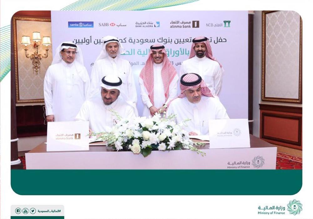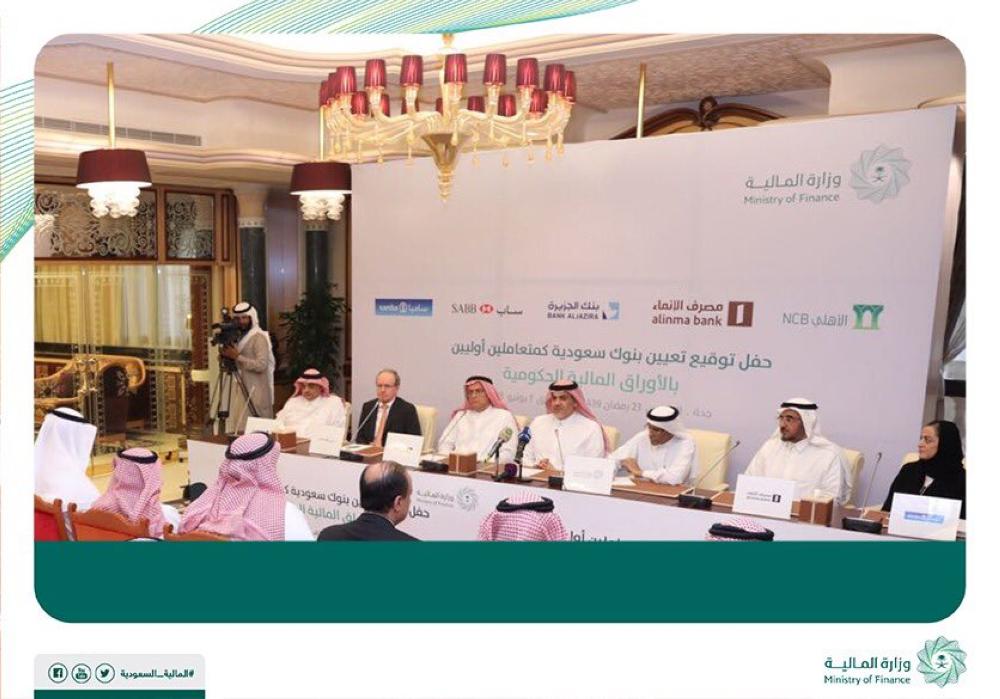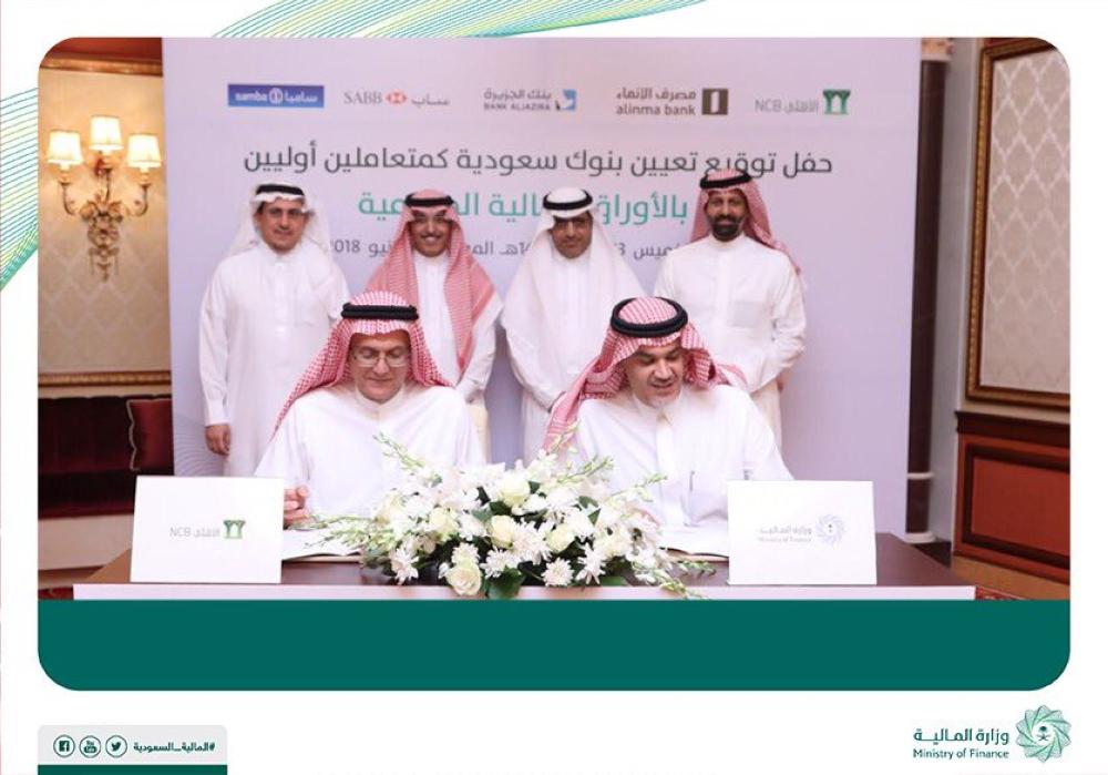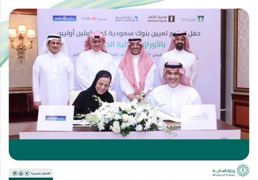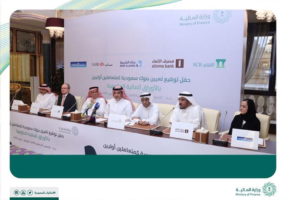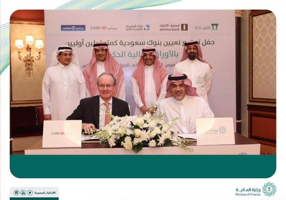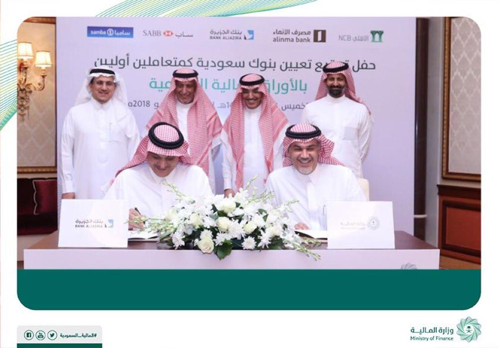 عيَّنت وزارة المالية اليوم (الخميس)، البنك الأهلي التجاري، والبنك السعودي البريطاني (ساب)، وبنك الجزيرة، ومجموعة سامبا المالية، ومصرف الإنماء، كمتعاملين أوليين بالأوراق المالية الحكومية.