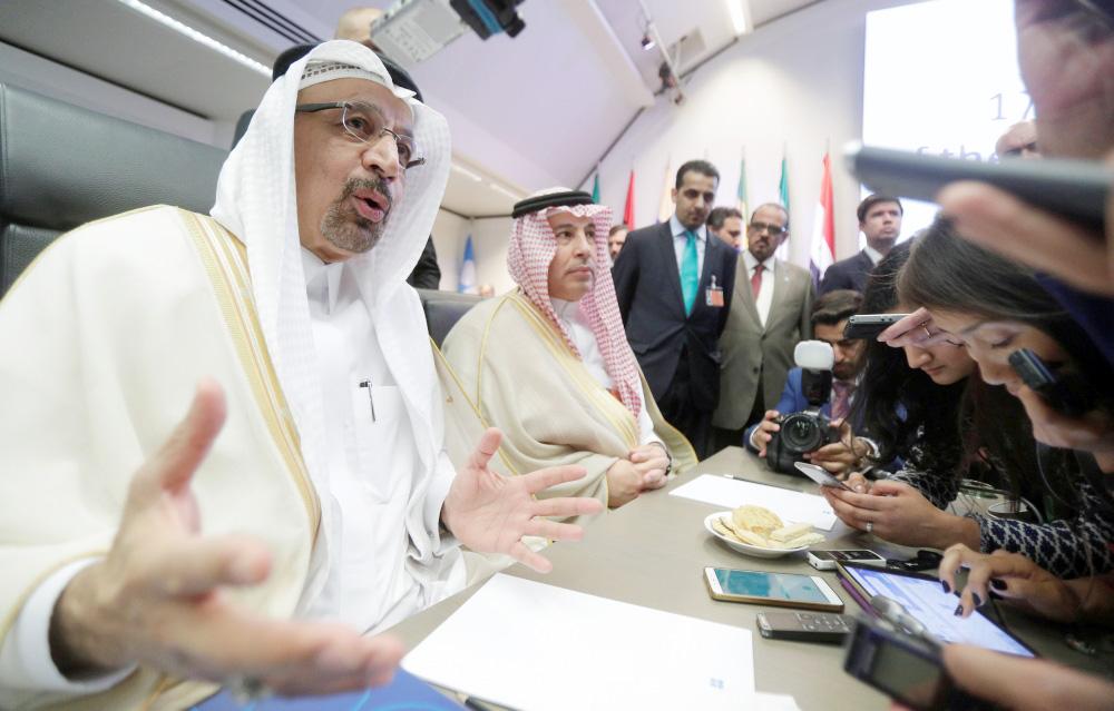 الفالح مجيبا على أسئلة الصحفيين على هامش اجتماع «أوبك».