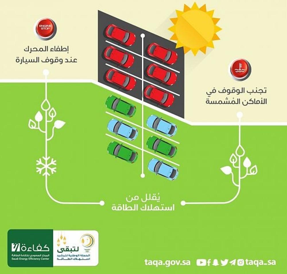 حث المركز السعودي لكفاءة الطاقة (كفاءة) على إطفاء محرك السيارة عند التوقف لفترات طويلة، حيث إنه من الأسباب المهمة للتوفير في استهلاك الطاقة، إضافة إلى الوقوف في الظل قدر الإمكان، وتجنب الوقوف في الأماكن المشمسة.
