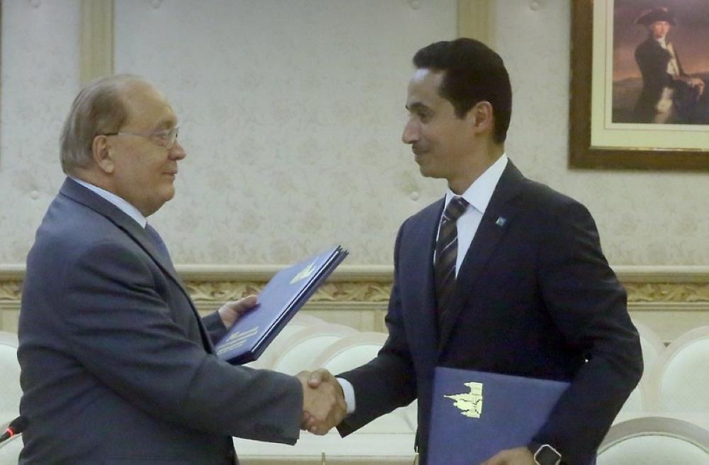 مدير مركز إكسبك للأبحاث المتقدمة علي المشاري مصافحا رئيس جامعة لومونوسوف موسكو الروسية عقب التوقيع.
