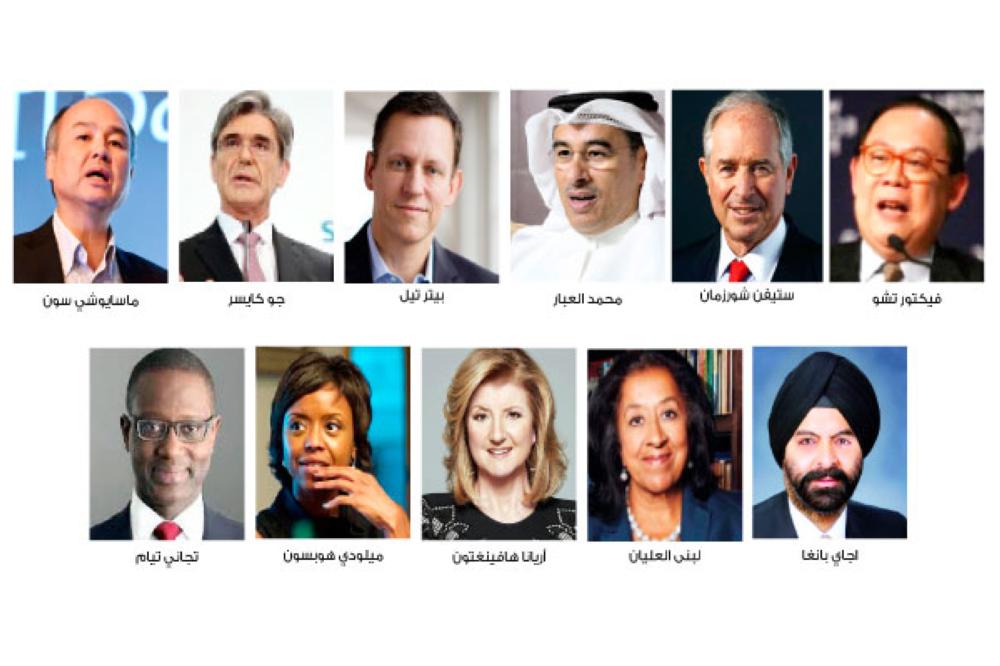 الرئيس التنفيذي ونائب رئيس مجلس الإدارة لشركة العليان المالية لبنى العليان، والرئيس التنفيذي لشركة بلاكستونماسايوشي سون، والرئيس التنفيذي لمجموعة سوفت بنك ستيفن شوارزمان، والرئيس التنفيذي، مجموعة كريدي سويس تجاني تيام، والشريك المؤسس في صندوق فاوندرز بيتر ثيل.
