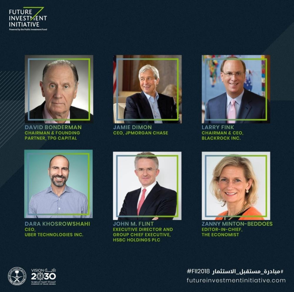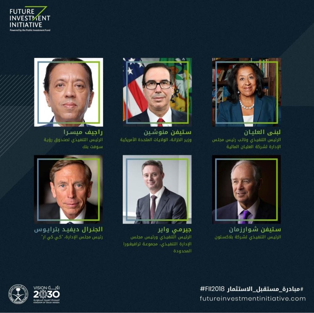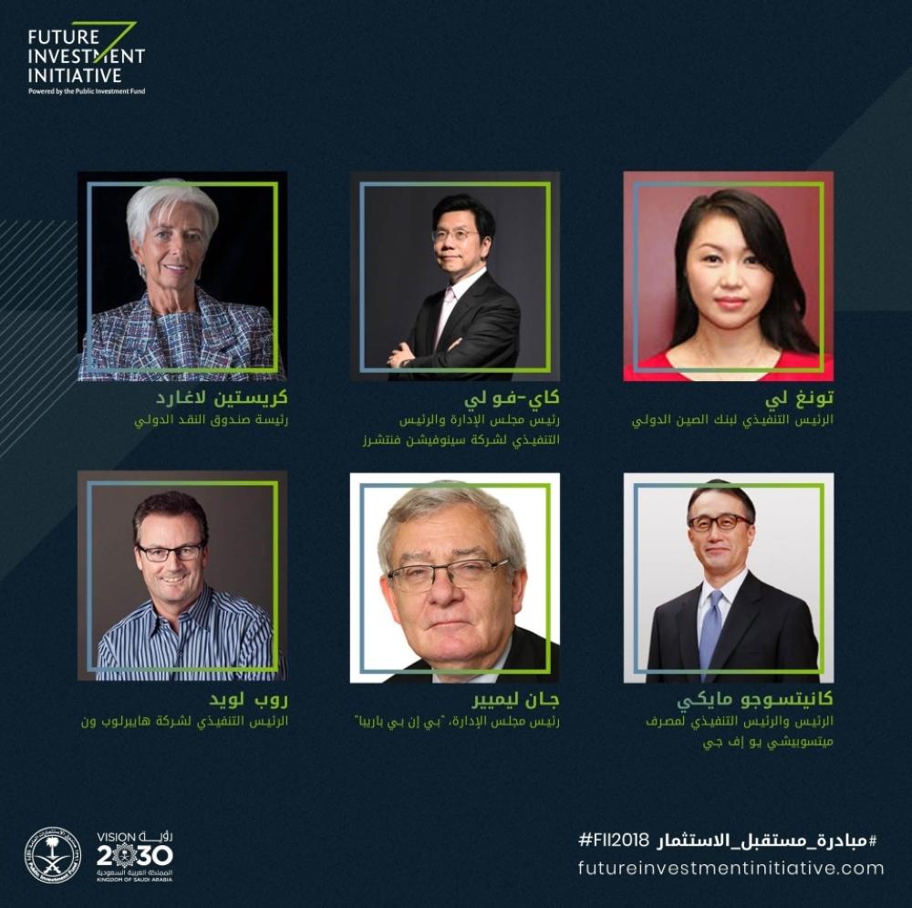 يذكر أن قائمة كبار المتحدثين تشمل: رئيس مجلس الإدارة والشريك المؤسس لشركة «تي بي جي» كابيتل ديفيد بوندرمان، والرئيس التنفيذي لشركة جي بي مورغان تشيس، ورئيس مجلس الإدارة والرئيس التنفيذي في شركة بلاك روك لاري فينكجيمي ديمون، والمدير التنفيذي والرئيس التنفيذي، مجموعة «إتش إس بي سي» القابضة جون فلينت، والرئيس التنفيذي لأوبر تكنولوجي دارا خسروشاهي، ورئيسة صندوق النقد الدولي كريستين لاغارد، ورئيس مجلس الإدارة والرئيس التنفيذي لشركة سينوفيشن فنتشرز كاي-فو لي، والرئيس التنفيذي لبنك الصين الدولي تونغ لي، والرئيس التنفيذي لشركة هايبرلوب ون روب لويد، ورئيس مجلس الإدارة لـ «بي إن بي باريبا» جان ليميير، والرئيس التنفيذي لمصرف ميتسوبيشي يو إف جي كانيتسوجو مايكي، ورئيس التحرير، ذي إيكونوميست، وزانى مينتون بيدويس، والرئيس التنفيذي لصندوق رؤية سوفت بنك، كبير مستشاري الاستثمار بمجموعة سوفت بنك راجيف ميسرا، ووزير الخزانة في الولايات المتحدة الأمريكية ستيفن منوشين، والرئيس التنفيذي ونائب رئيس مجلس الإدارة لشركة العليان المالية لبنى العليان، ورئيس مجلس الإدارة، «كي كي ار» الجنرال ديفيد بترايوس، والرئيس التنفيذي ورئيس مجلس الإدارة التنفيذي، مجموعة ترافيغورا المحدودة جيرمي واير، والرئيس التنفيذي لشركة بلاكستون ستيفن شوارزمان.