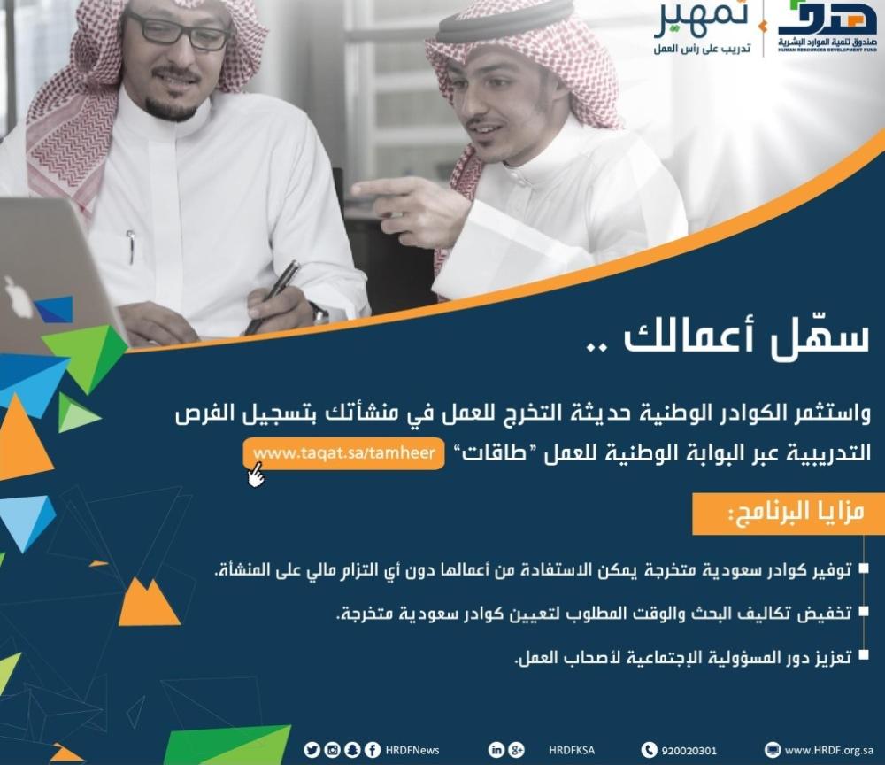 دعا صندوق تنمية الموارد البشرية (هدف)، منشآت القطاع الخاص إلى الانضمام لبرنامج التدريب على رأس العمل «تمهير»، وطرح فرص التدريب المتاحة لديها أمام الكوادر الوطنية، دون أي التزامات مالية أو تعاقدية عليها لصالح الصندوق، من خلال التسجيل عبر البوابة الوطنية للعمل «طاقات».
