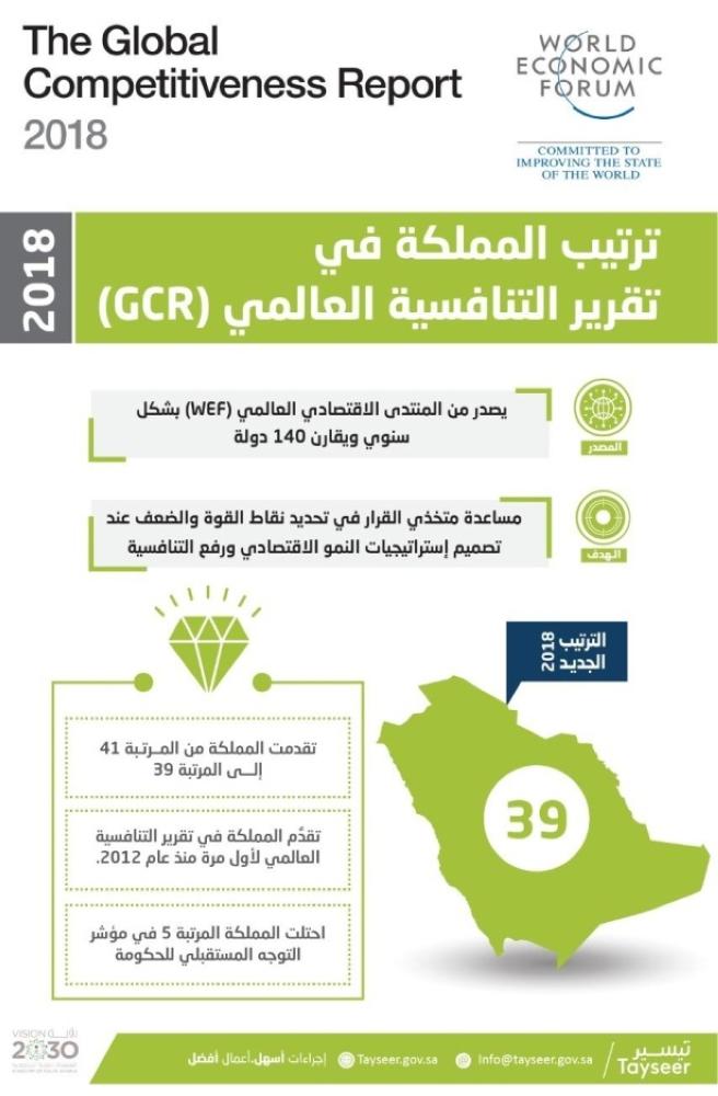 حققت المملكة العربية السعودية أفضل تقدم في تقرير التنافسية العالمي (GCR) للعام 2018م، الصادر عن المنتدى الاقتصادي العالمي (WEF)، حيث حلّت بالمرتبة 39 من أصل 140 دولة، ويشكل هذا التقدم التحسّن الأفضل للمملكة في الترتيب منذ العام 2012م.